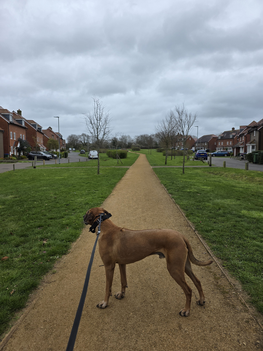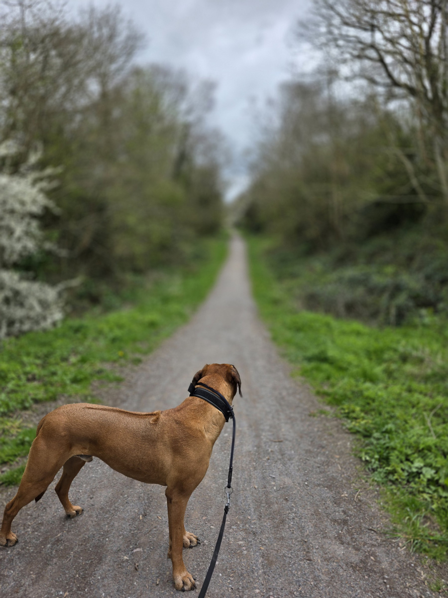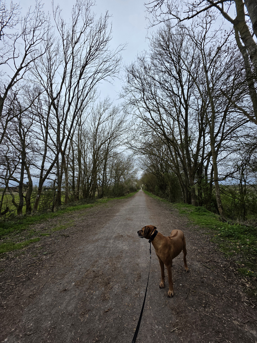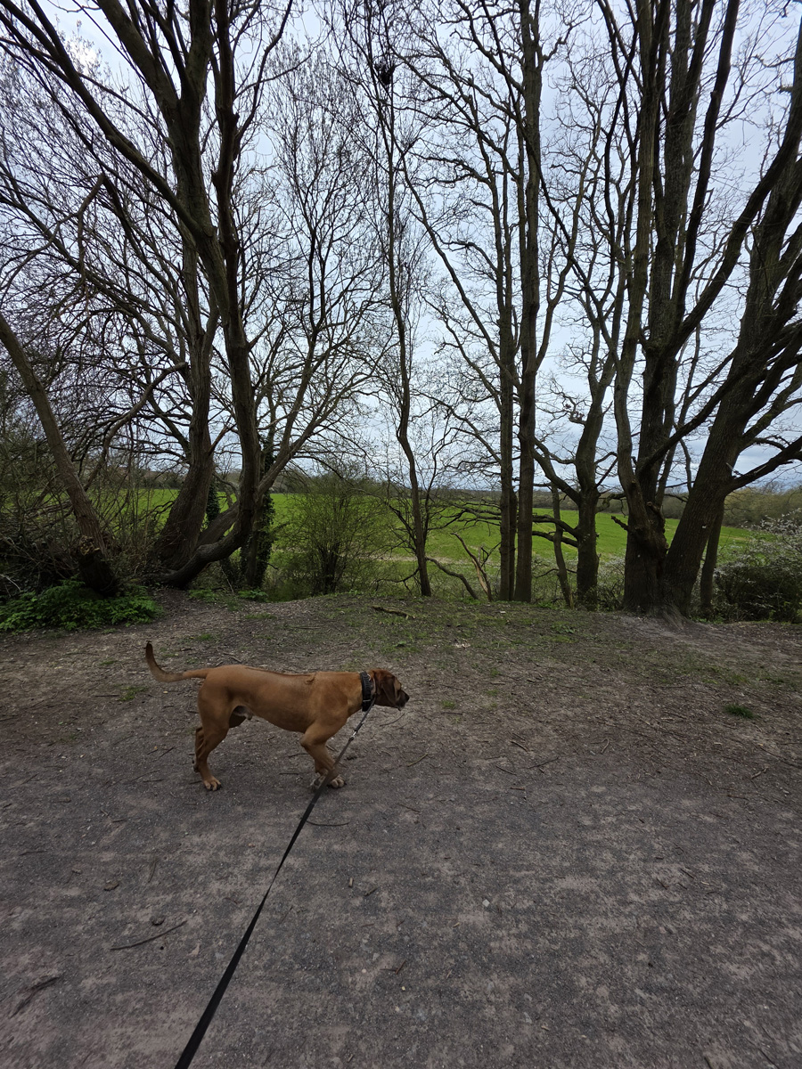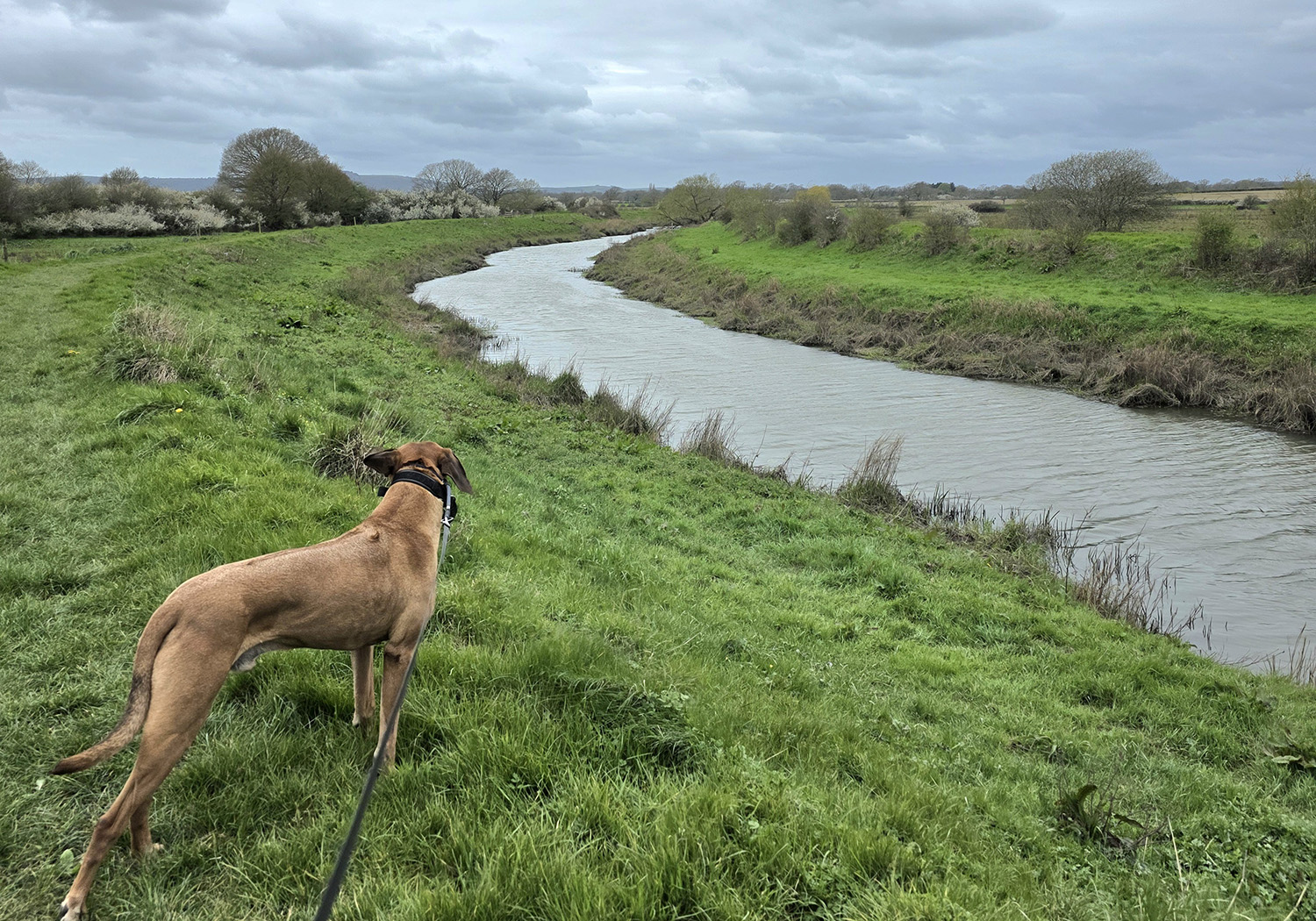 Mostly a very flat walk. The downs link section at the start is gravel paths, then some grassy trails by the river before private road sections to end. Nothing muddy at all when we went but river section can get flooded so will be boggy areas in wetter seasons. Are a couple of stiles - no doggy doors, but some worn paths under barb wire and gates so not ideal, but we got through without too much issue.