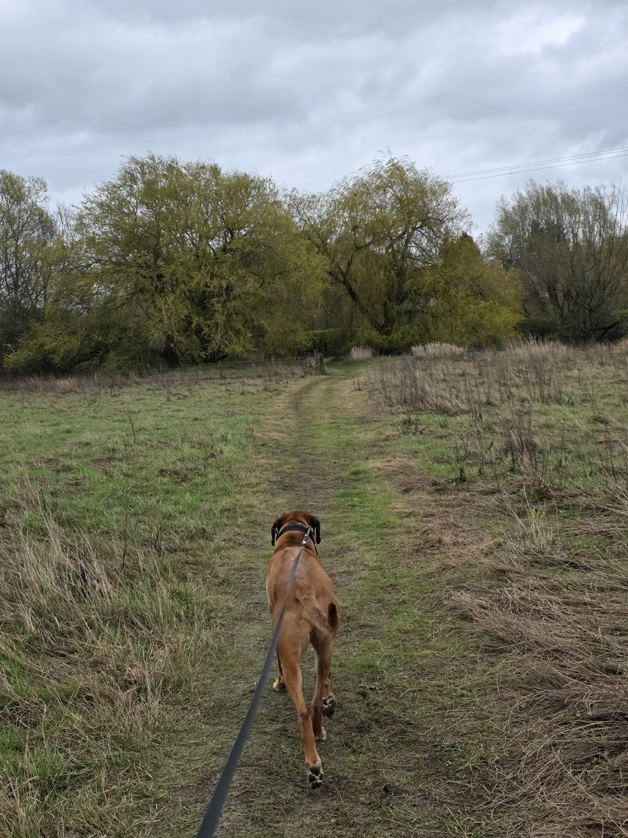 We avoided the first couple of footpath signs to get away from the river (although both would take you back without too much variation of route), but when we did the path led between some willow trees, between some properties and then the private roads take you back, with a short section near the end through the residential green/childrens play area.