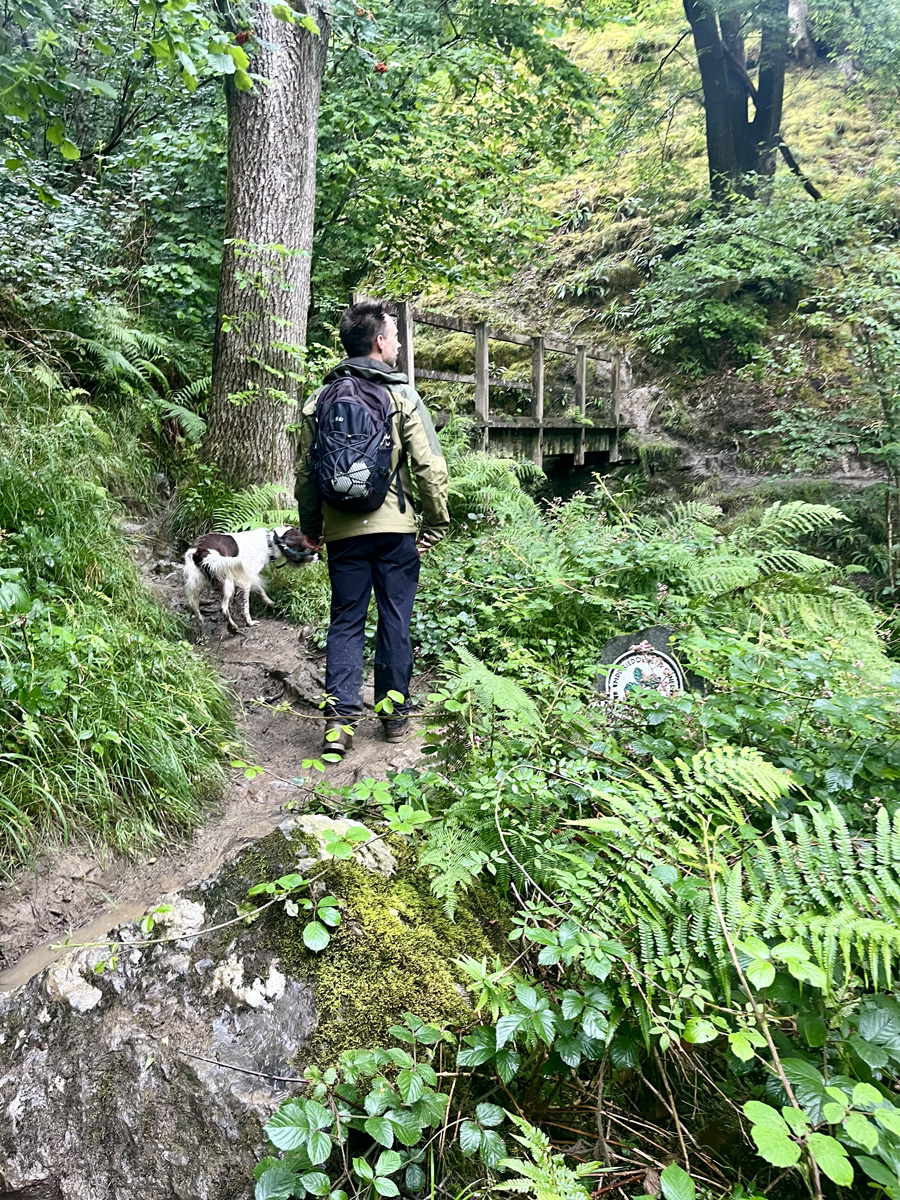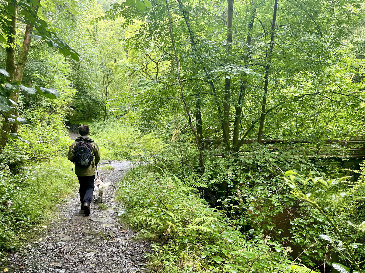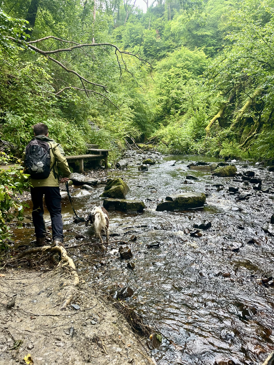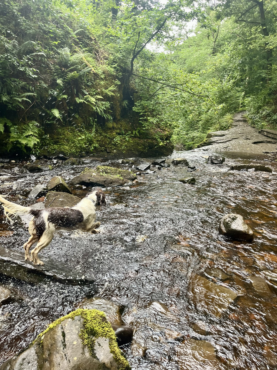 A walk with a bit of everything, stiles, hills, waterfalls, country parks, cafe and a pub. Certainly not a route for push chairs, 4 paw drive most definitely required. It's going to be muddy in the winter and walking through the woodland areas is lumpy underfoot.