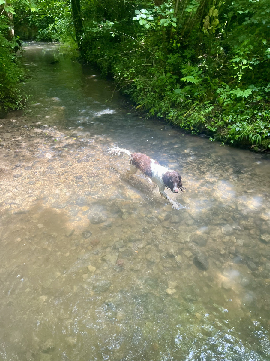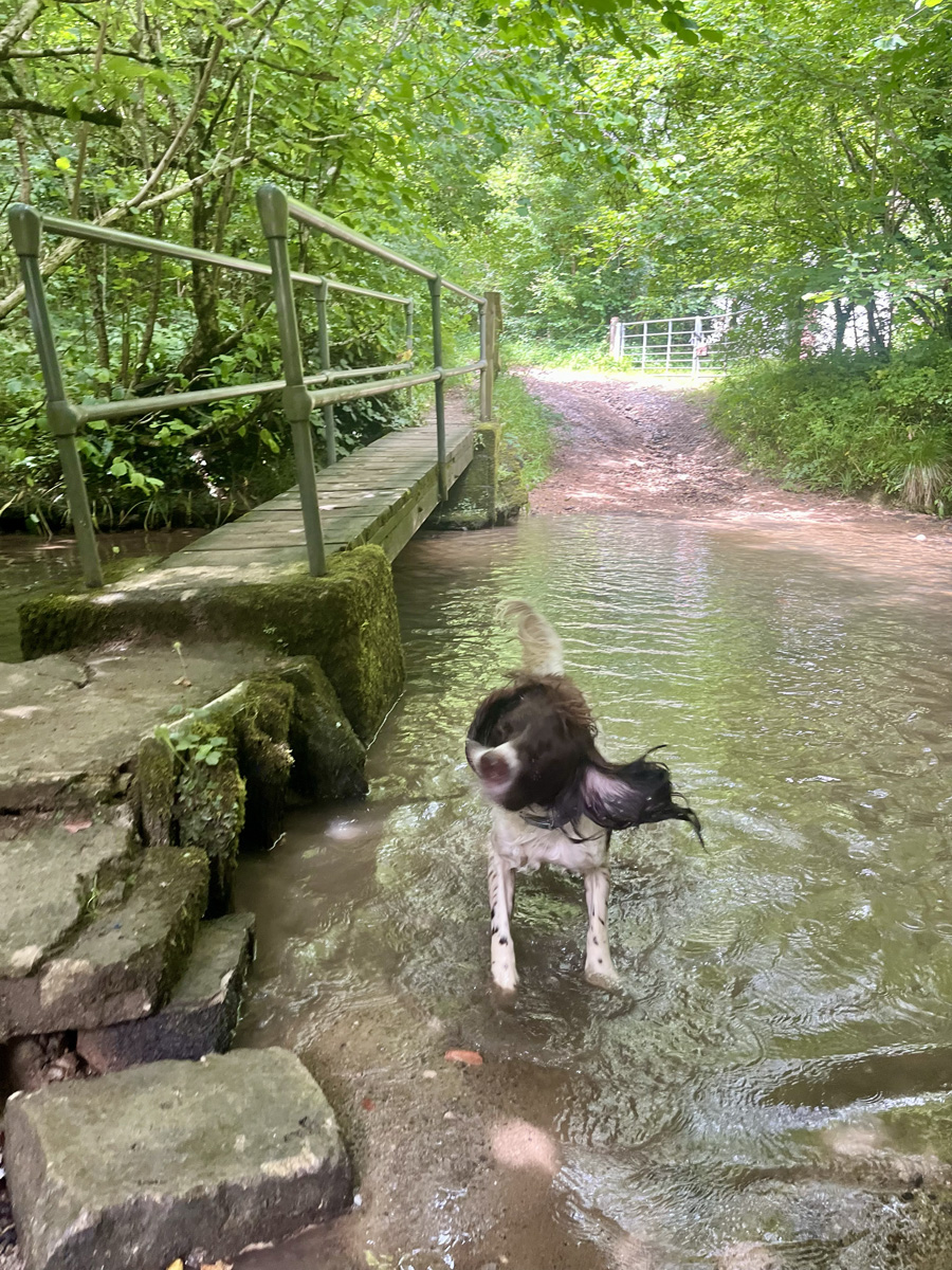 There is a small brook with a bridge across it half way, not that deep and a great spot for the dogs to have a splash about in.